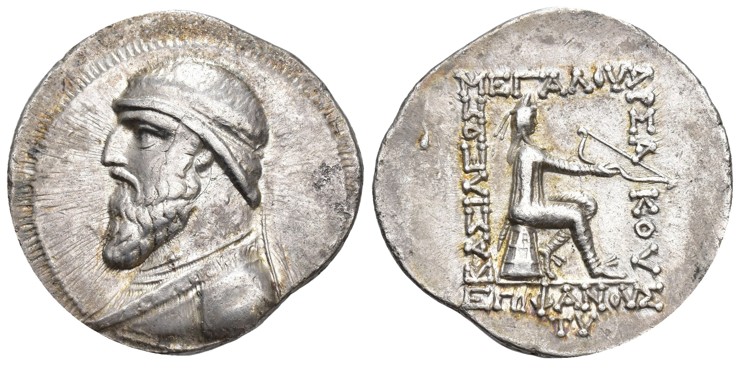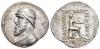 GRECIA ANTIGUA. PARTIA. Mitridates II. Seleucia. Tetradracma (123-87 a.C.). A/ Busto diademado y drapeado a izq. R/ El rey con kyrbasa, manto y arco sentado sobre ónfalos a der., alrededor ley. griega, debajo TV. AR 15,57 g. 32,3 mm. COP-23; SEP-24. Pequeñas marcas. MBC.
