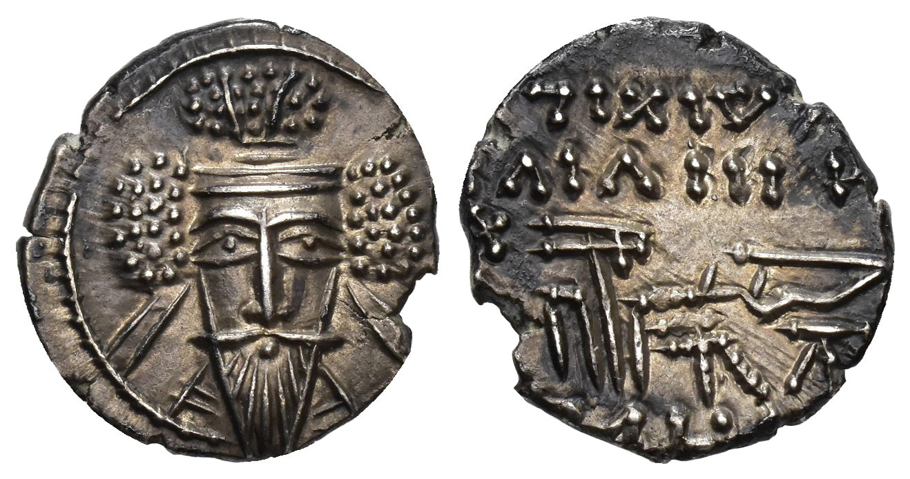 GRECIA ANTIGUA. PARTIA. Vologases V. Ecbatana. Dracma (191-208 d.C.). A/ Busto frontal diademado R/ Arquero sentado a der., alrededor leyenda. AR 3,67 g. 18,4 mm. SEP-86.3. Defectos de cospel. EBC.