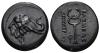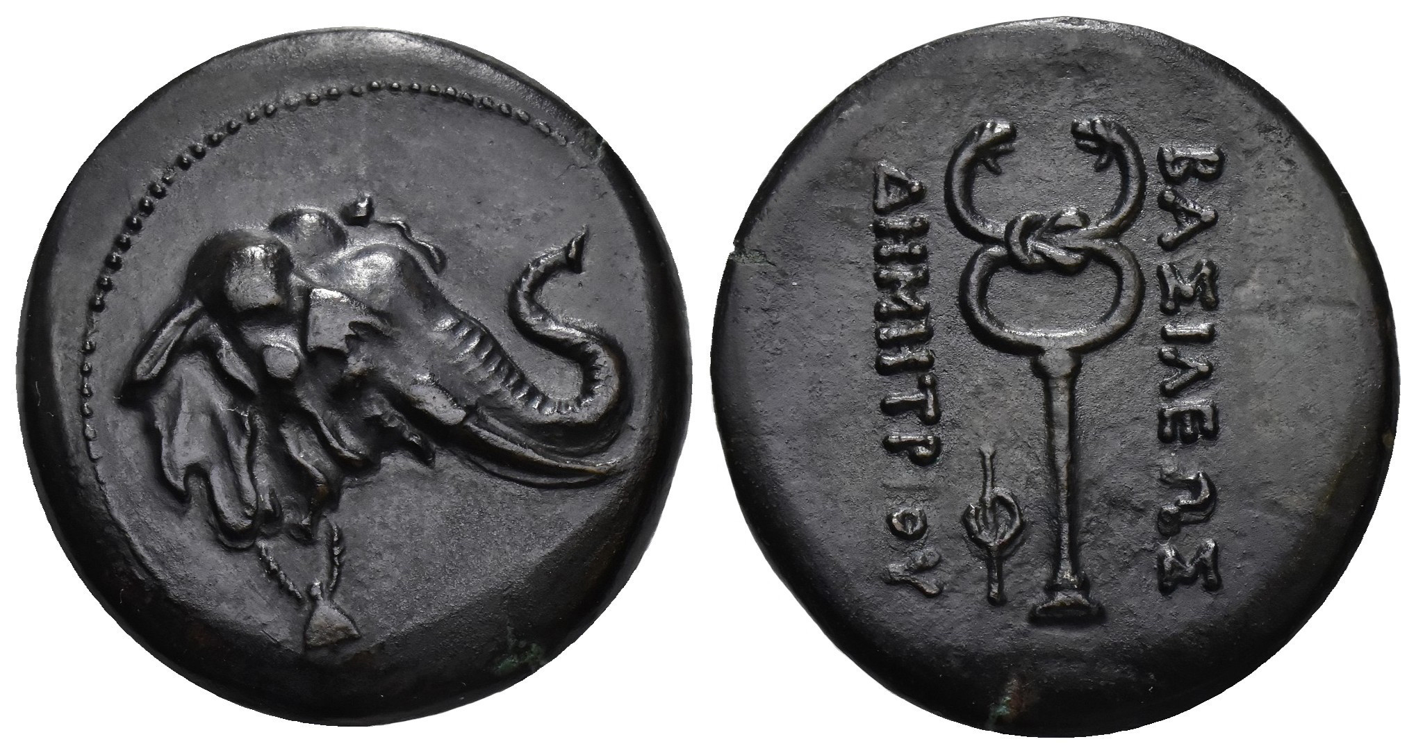 GRECIA ANTIGUA. BACTRIA. Demetrio I. AE (c. 200-170 a.C.). A/ Cabeza de elefante a der. con campana al cuello. R/ Caduceo, a izq. monograma; BASILEWS/DEMETRIOU. AE 12,02 g. 28,3 mm. COP-263. Pátina oscura. EBC-.