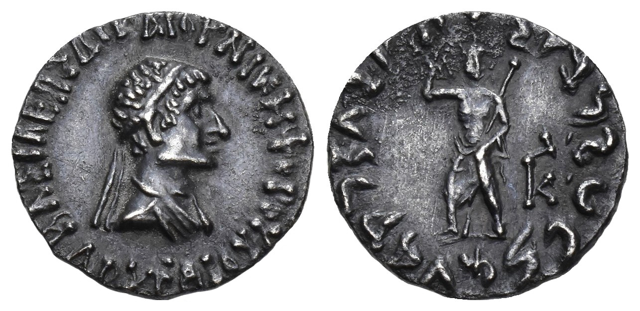 GRECIA ANTIGUA. REINO INDOGRIEGO. Arquebio I. Dracma (90-80 a.C.). A/ Busto diademado a der. R/ Zeus a izq. con cetro y blandiendo haz de rayos, detrás monograma; ley. karosti. AR 2,33 g. 16,9 mm. COP-328. Concreciones en rev. Pátina oscura. MBC+.