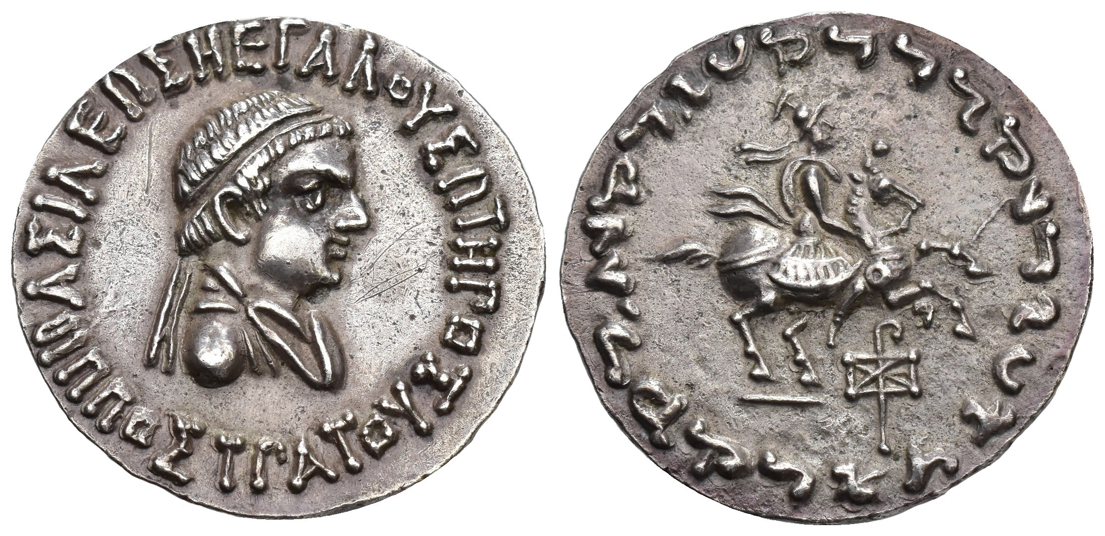 GRECIA ANTIGUA. REINO INDOGRIEGO. Hipostrato. Tetradracma (68-50 a.C.). A/ Busto diademado y drapeado a der. R/ El rey a caballo a der., en campo monograma, alrededor ley. Karosti. AR 9,67 g. 30,1 mm. COP-358 var. Pequeñas marcas. MBC+.