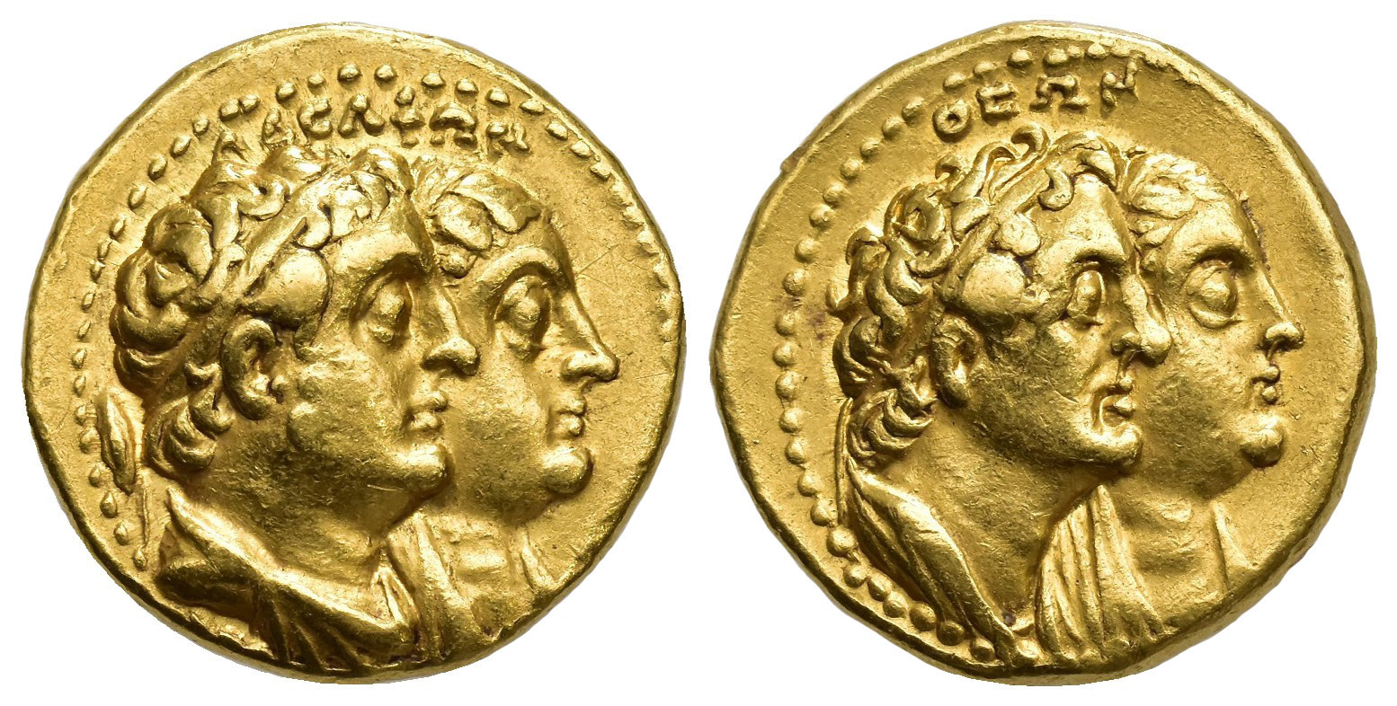 GRECIA ANTIGUA. REINO PTOLEMAICO. Ptolomeo II y Arsínoe. Alejandría. Tetradracma (post. 265 a.C.). A/ Bustos de Ptolomeo II y Arsínoe II, detrás escudo; ADELFWN. R/ Bustos de Ptolomeo I y Berenice I; QEWN. AR 13,8 g. 20,9 mm. COP-133. MBC+. Muy escasa.