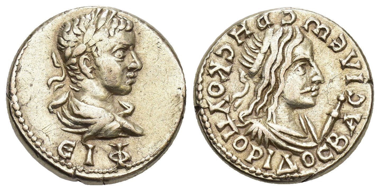 GRECIA ANTIGUA. REYES DEL BÓSFORO. Rheskuporis III o IV. Estátera (época de Heliogábalo). A/ Busto diademado y drapeado a der.; BACILEwC PHCKOVPORIDOC. R/ Busto laureado, drapeado y acorazado a der. de ¿Heliogábalo?, debajo EIF. EL 7,39 g. 19,2 mm. COP-71 var. MBC.