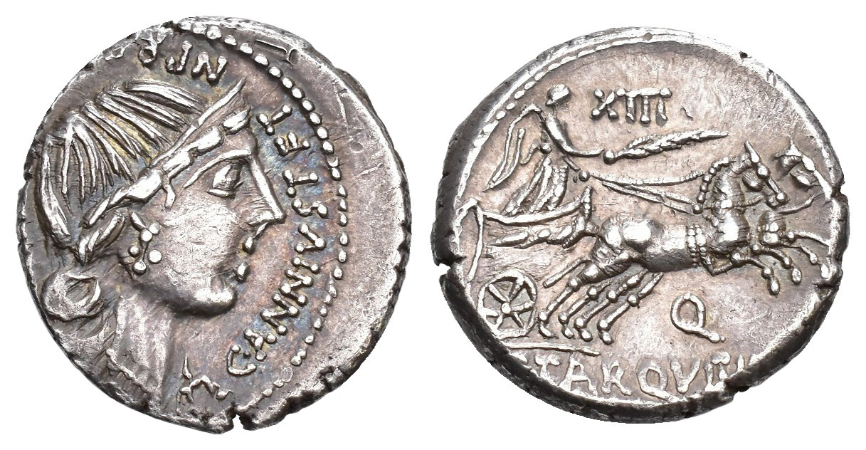 REPÚBLICA ROMANA. ANNIA. C. Annius y C. Tarquitus. Denario. Hispania (82-81 a.C.). A/ Cabeza femenina diademada a der., debajo balanza; C ANNIVS T F T N PR(O COS EX S C). R/ Victoria en biga, encima XIII, debajo Q, en exergo (C) TARQVITI (P F). AR 3,9 g. 18,9 mm. CRAW-366.4; FFC-134. Anv. descentrado. MBC+. Escasa.