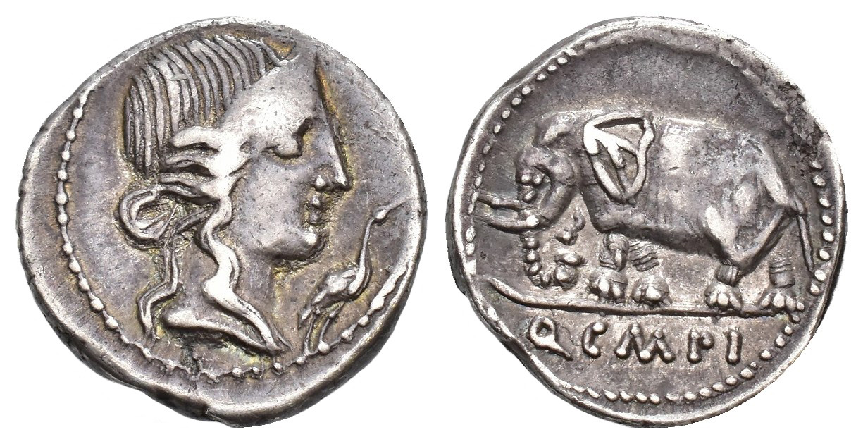 REPÚBLICA ROMANA. CAECILIA. Q. Caecilus Metellus Pius. Denario. Roma (81 a.C.). A/ Cabeza de Pietas a der., delante cigüeña. R/ Elefante a izq.; en exergo Q C M P I. AR 3,85 g. 18,2 mm. CRAW-374.1; FFC-213. MBC.