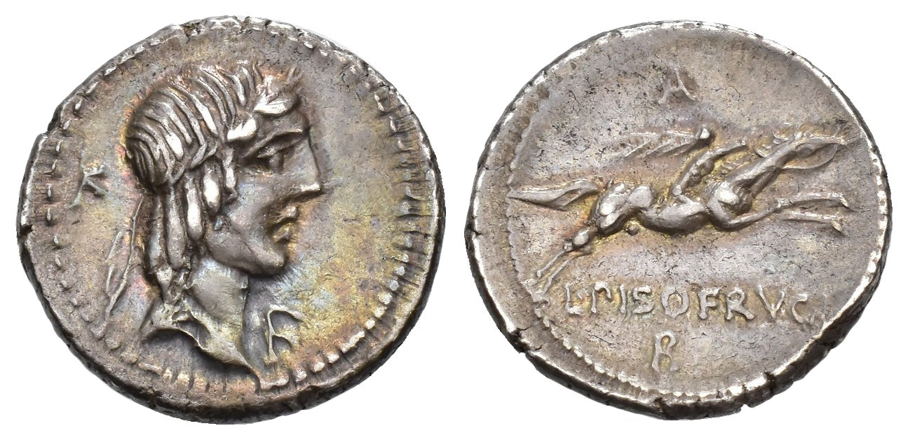 REPÚBLICA ROMANA. CALPURNIA. L. Calpurnius Piso Frugi. Denario. Roma (90-89 a.C.). A/ Cabeza de Apolo a der., detrás K y F debajo del mentón. R/ Jinete cabalgando a der.; A encima del jinete, debajo L PISO FRVGI/ B. AR 3,95 g. 18,4 mm. CRAW-340.1; FFC-276. Pátina gris. EBC-.
