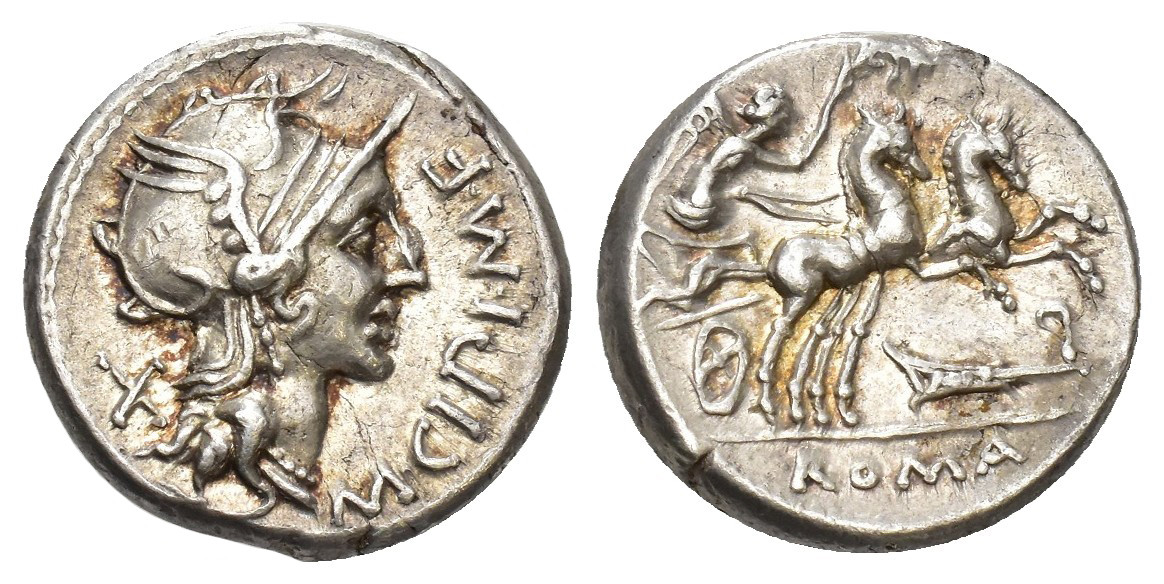 REPÚBLICA ROMANA. CIPIA. M. Cipius M. f. Denario. Roma (115-114 a.C.). A/ Cabeza de Roma a der.; M CIPI M F. R/ Victoria en biga, debajo timón; ROMA. AR 4 g. 17 mm. CRAW-289.1; FFC-563, mismo ejemplar. EBC-.