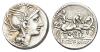 REPÚBLICA ROMANA. CLAUDIA. Appius Claudius Pulcher y T. Mallius Mancinus. Denario. Roma (110-109 a.C.). A/ Cabeza de Roma a der., detrás círculo dentro de triángulo. R/ Victoria en triga a der.; AP CL T MANL Q VR. AR 3,84 g. 16,6 mm. CRAW-299.1a; FFC-564. MBC+.