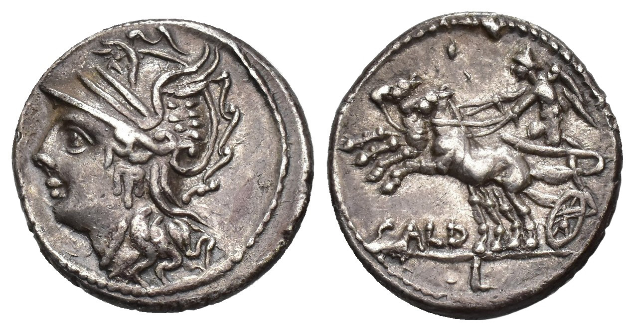 REPÚBLICA ROMANA. COELIA. C. Coelius Caldus. Denario. Roma (104 a.C.). A/ Cabeza de Roma a izq. R/ Victoria en biga a izq., debajo CALD, en exergo letra. AR 3,91 g. 19,6 mm. CRAW-318.1b; FFC-575. MBC+.