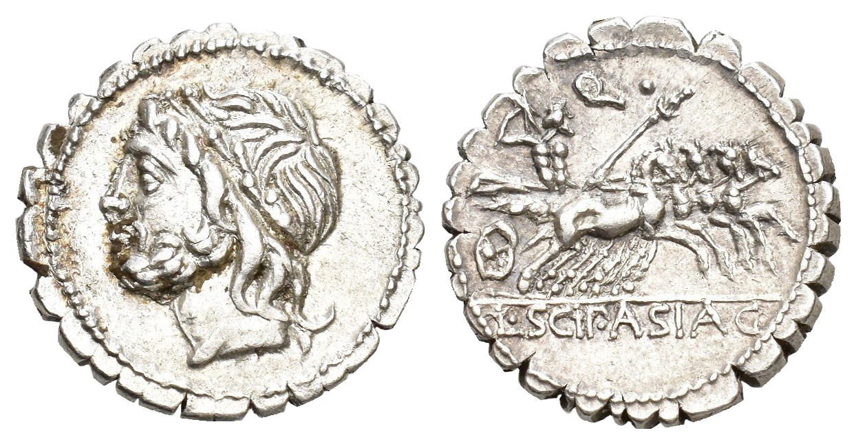 REPÚBLICA ROMANA. CORNELIA. L. Cornelius Scipius Asiaticus. Denario. Roma (106 a.C.). A/ Cabeza laureada de Júpiter a izq. R/ Júpiter en cuadriga a der. con cetro y rayo; encima: Q, exergo L SCIP ASIAG. CRAW-311.1; FFC-612. AR 4,04 g. 18,6 mm. Pequeñas marcas. EBC/EBC+.