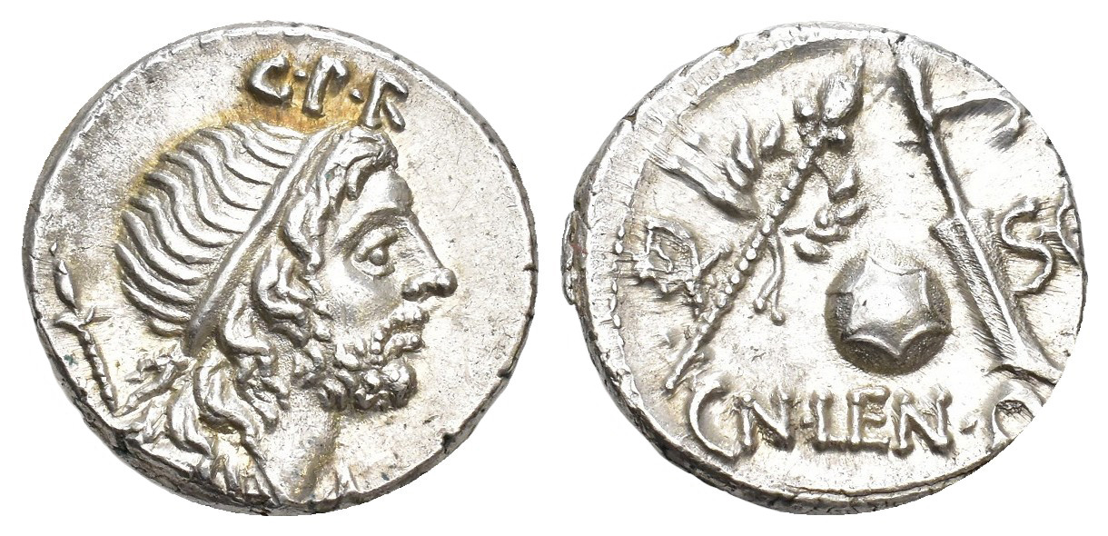 REPÚBLICA ROMANA. CORNELIA. Cn. Cornelius Lentulus Marcelinus. Denario. Hispania (76-75 a.C.). A/ Busto del Genio Romano a der., detrás cetro, encima G P R. R/ Cetro con corona, timón y globo; CN LEN Q, EX-S C. AR 3,97 g. 17,5 mm. CRAW-393.1a; FFC-626. EBC-.
