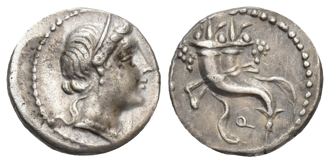 REPÚBLICA ROMANA. CORNELIA. L. Cornelius Sylla Felix. Denario. Ceca oriental (81 a.C.). A/ Cabeza de Venus diademada a der. R/ Doble cornucopia, debajo Q. AR 3,8 g. 18,2 mm. CRAW-375.2; FFC-629. MBC+.