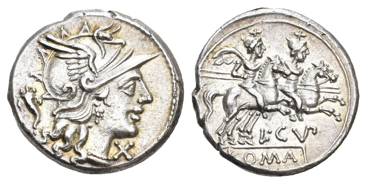 REPÚBLICA ROMANA. CUPIENNA. L. Cupiennius. Denario. Roma (147 a.C.). A/ Cabeza de Roma a der., detrás cornucopia. R/ Dióscuros cabalgando a der., debajo L CVP, exergo ROMA. AR 3,83 g. 18,1 mm. CRAW-218.1; FFC-665. EBC-.