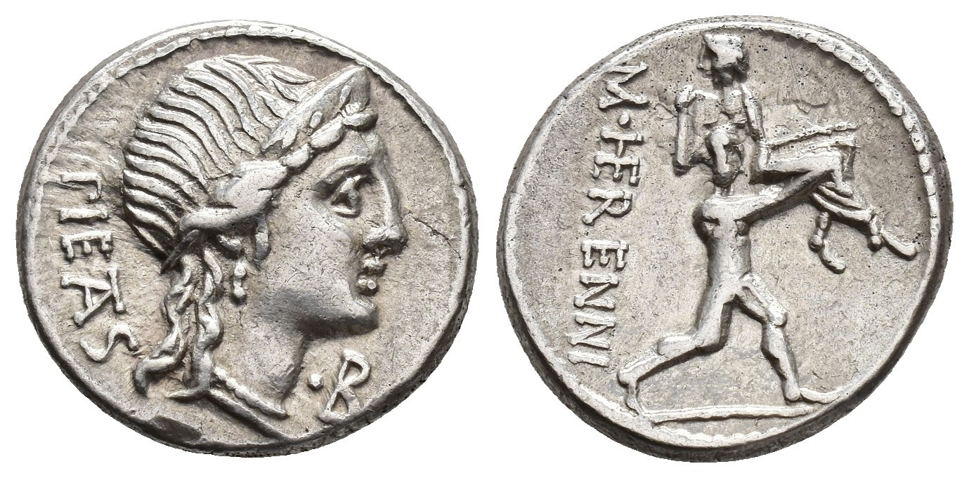 REPÚBLICA ROMANA. HERENNIA. Marcus Herennius. Denario. Roma (108-107 a.C.). A/ Cabeza de Pietas a der., delante B, detrás PIETAS. R/ Anfínomo a der. cargando a su padre, detrás M HERENNI. AR 3,98 g. 17,6 mm. CRAW-308.1a; FFC-743. MBC-.