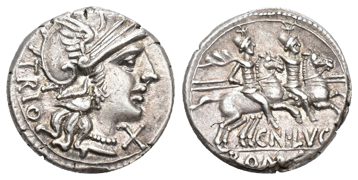REPÚBLICA ROMANA. LUCRETIA. Cn. Lucretius Trio. Denario. Roma (136 a.C.). A/ Cabeza de Roma a der. delante X y detrás TRIO. R/ Dióscuros a der.; CN LVCR/ (ROMA). AR 3,89 g. 17,5 mm. CRAW-237-1; FFC-822. R.B.O. EBC-.