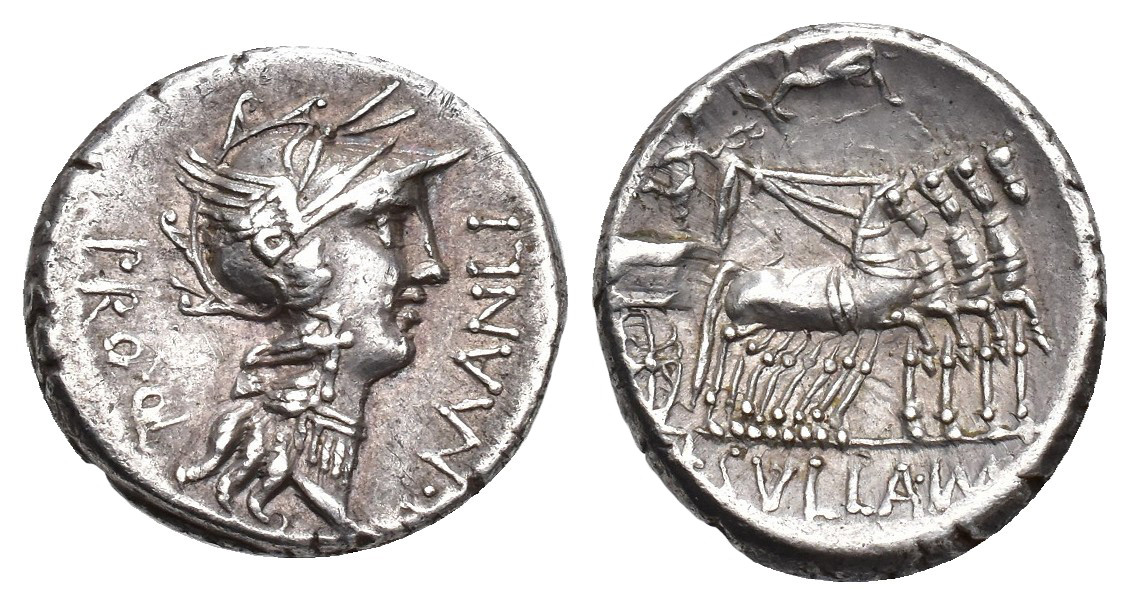 REPÚBLICA ROMANA. MANLIA. L. Manlius Torquatus. Denario. Roma (82 a.C.). A/ Cabeza de Roma a der., delante L MANLI, detrás PROQ. R/ Sila en cuadriga a der. coronado por Victoria; exergo L SVLLA IM. AR 3,94 g. 16,3 mm. CRAW-367.5; FFC-839. MBC+/EBC-.