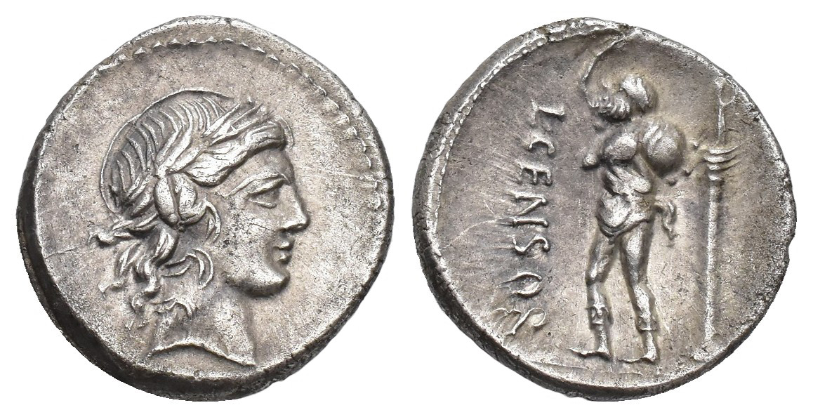 REPÚBLICA ROMANA. MARCIA. L. Marcius Censorinus. Denario. Roma (88 a.C.). A/ Cabeza de Apolo a der. R/ Marsyas a izq., detrás columna; L CENSOR. AR 3,61 g. 17,5 mm. CRAW-363.1d; FFC-888. MBC+.
