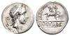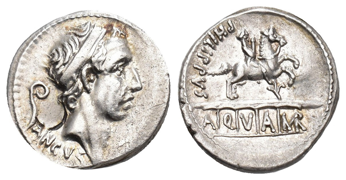 REPÚBLICA ROMANA. MARCIA. C. Marcius Philippus. Denario. Roma (56 a.C.). A/ Cabeza de Anco Marcio diademada a der., detrás lítuo; ANCVS. R/ Estatua ecuestre a der. sobre acueducto esquemático de 5 huecos en los que se lee AQVA MAR PHILIPPVS. AR 4,2 g. 18 mm. CRAW-425.1; FFC-894. Contramarca en anv. R.B.O. EBC-/EBC.