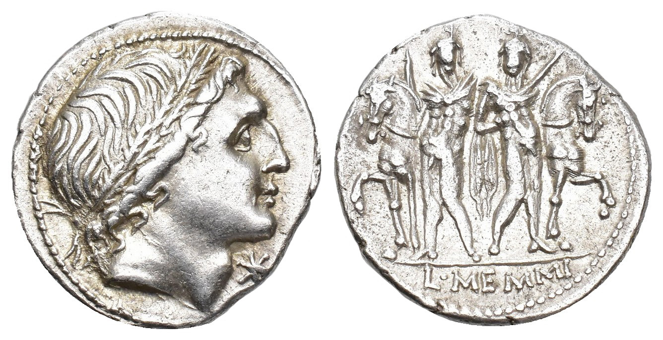 REPÚBLICA ROMANA. MEMMIA. L. Memmius. Denario. Roma (109-108 a.C.). A/ Cabeza masculina a der. R/ Dióscuros de frente con las riendas de sus caballos, exergo L MEMMI. AR 3,87 g. 20,4 mm. CRAW-304.1; FFC-906. EBC-/MBC+.