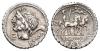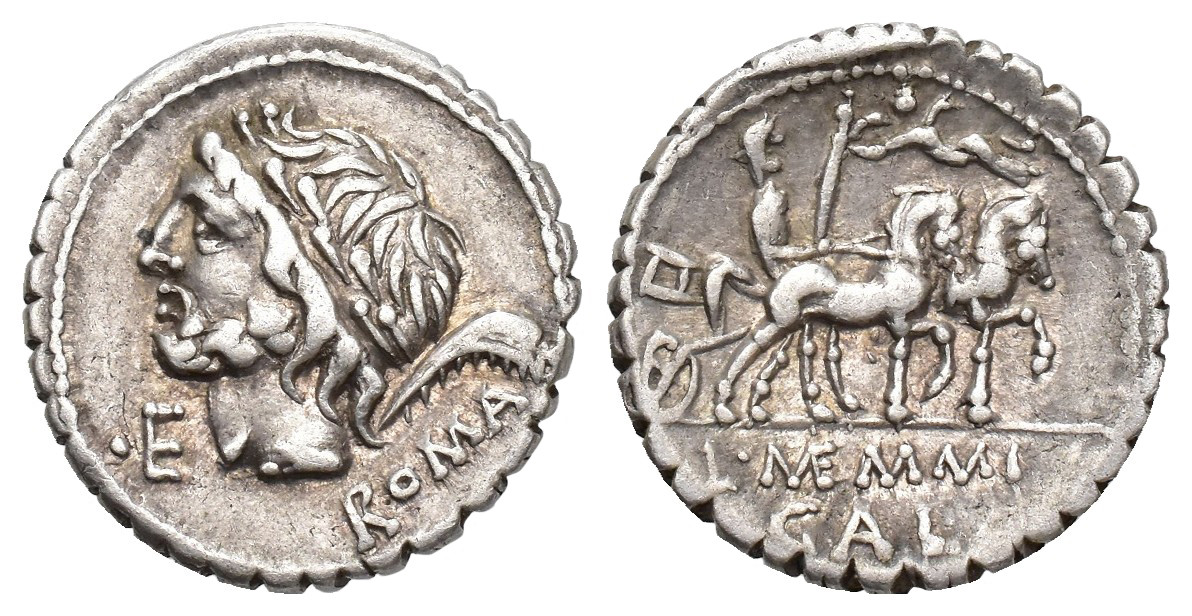 REPÚBLICA ROMANA. MEMMIA. L. Memmius Gal. Denario serrato. Roma (106 a.C.). A/ Cabeza de Saturno a izq., detrás guadaña y ROMA, delante E. R/ Venus en biga a der.; L MEMMI/GAL. AR 3,87 g. 18,1 mm. CRAW-313.1b; FFC-907. MBC+.