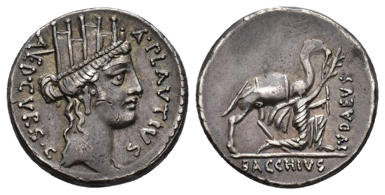 REPÚBLICA ROMANA. PLAUTIA. A. Plautius. Denario. Roma (55 a.C.). A/ Cabeza de Cibeles; A PLAVTIVS AED CVR S C. R/ Bacchius arrodillado con camello; BACCHIVS IVDAEVS. AR 4,15 g. 17,3 mm. CRAW-431.1; FFC-1002. Contramarca en anv. MBC+.