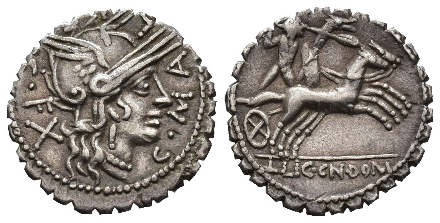 REPÚBLICA ROMANA. POBLICIA. C. Poblicius Malleolus C. f. Denario. Narbo (118 a.C.). A/ Cabeza de Roma a der.; C MALLE C F. R/ Bituitio en biga a der. con escudo, carnyx y lanzando jabalina, en exergo L LIC CN DOM. AR 3,83 g. 19 mm. CRAW-282.3; FFC-1010. MBC.