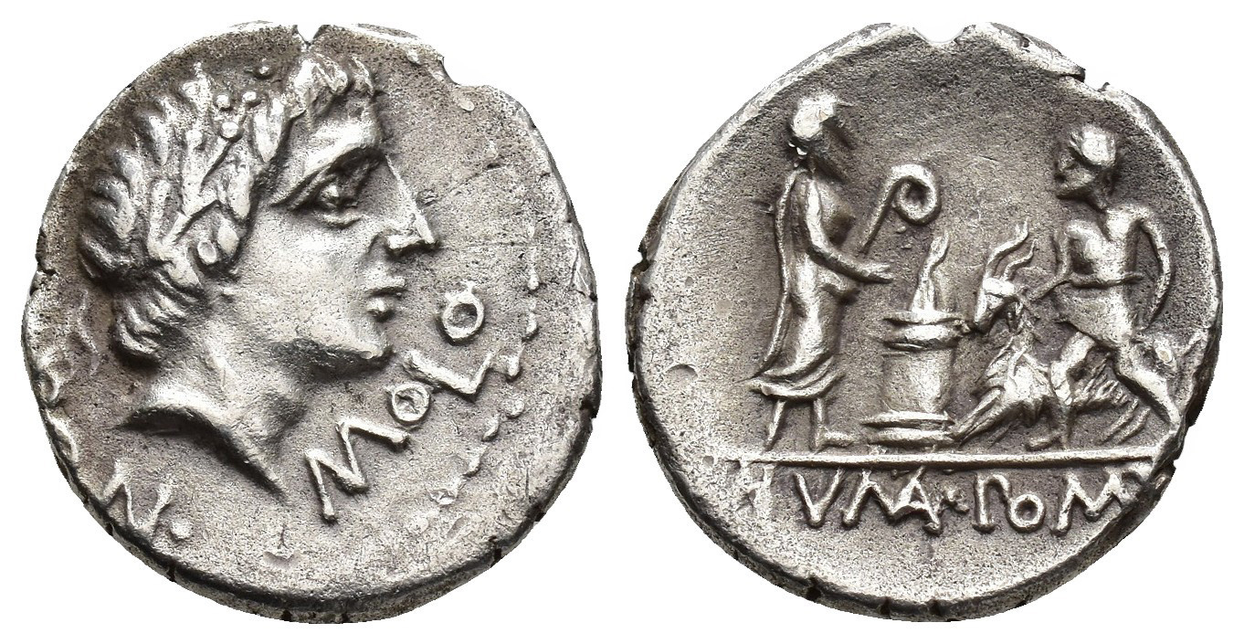 REPÚBLICA ROMANA. POMPONIA. L. Pomponius Molo. Denario. Roma (97 a.C.). A/ Cabeza de Apolo a der., L POMPON MOLO. R/ Numa Pompilio a der. frente a altar para sacrificar una cabra ayudado por un joven; exergo NVMA POMPIL. AR 3,88 g. 17,3 mm. CRAW-334.1. FFC-1030. Cospel irregular. MBC+.