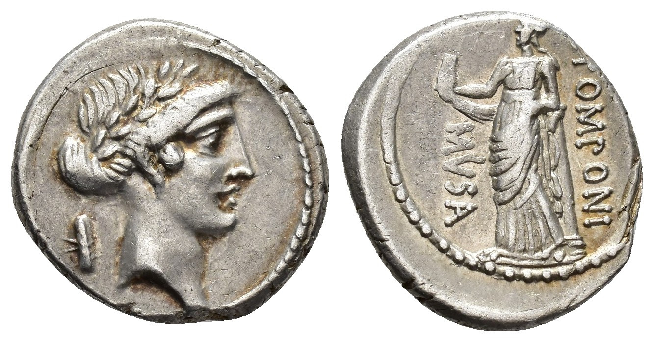 REPÚBLICA ROMANA. POMPONIA. Q. Pomponius Musa. Denario. Roma (66 a.C.). A/ Cabeza de Apolo laureado a der., detrás volumen. R/ Clío con libro apoyada en columna, a izq. MVSA, a der. Q POMPONI. AR 3,94 g. 17,6 mm. CRAW-410.3; FFC-1035. EBC-/MBC. Escasa.