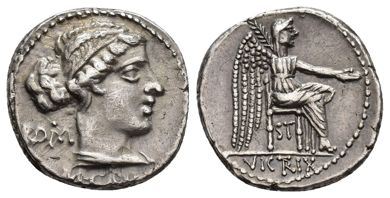 REPÚBLICA ROMANA. PORCIA. M. Porcius Cato. Denario. Roma (89 a.C.). A/ Cabeza de Libertas a der, detrás ROM, debajo M CATO, poco visible. R/ Victoria sentada a der. con pátera y palma, debajo ST, exergo VICTRIX. AR 3,97 g. 17,3 mm. CRAW-343.1c; FFC-1059. Rayita. EBC-/MBC+.