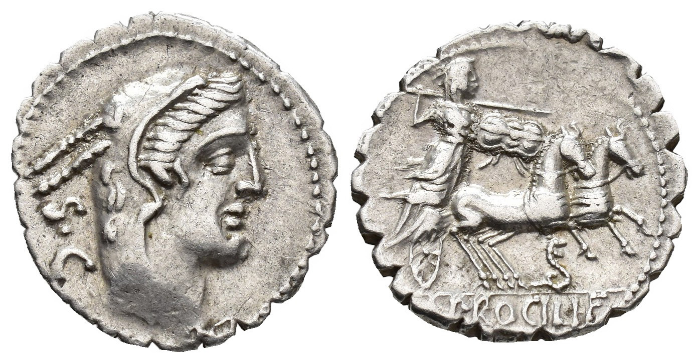 REPÚBLICA ROMANA. PROCILIA. L. Procilius. Denario serrato. Roma (80 a.C.). A/ Cabeza de Juno Sospita a der. R/ Juno Sospita en biga a der., debajo serpiente; L PROCILI F. AR 3,96 g. 18,1 mm. CRAW-379.2; FFC-1082. MBC+.
