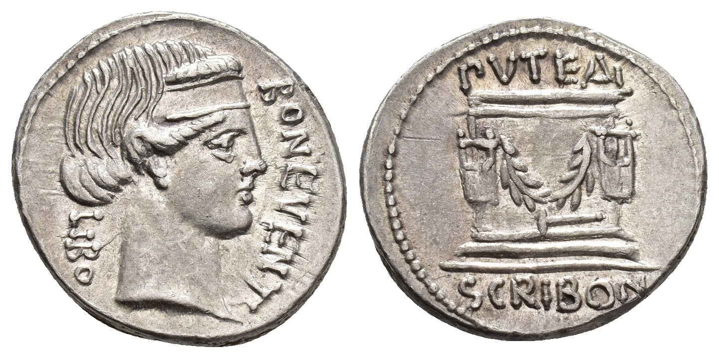 REPÚBLICA ROMANA. SCRIBONIA. L. Scribonius Libo. Denario. Roma (62 a.C.). A/ Cabeza de Bonus Eventus a der.; LIBO BON EVENT. R/ Pozo escriboniano decorado con un martillo en su base; PVTEAL/SCRIBON. AR 4,06 g. 18,7 mm. CRAW-416.1a; FFC-1102. B.O. EBC+.
