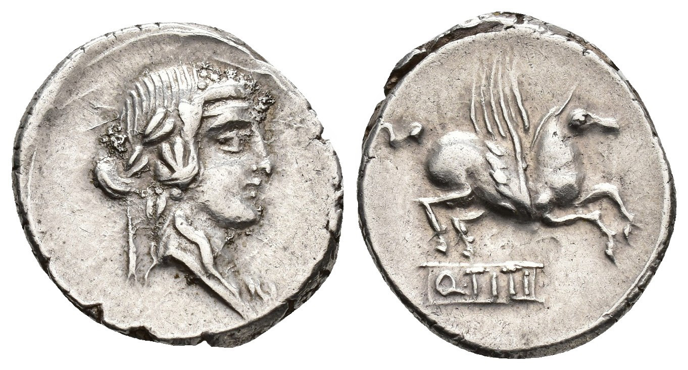 REPÚBLICA ROMANA. TITIA. Q. Titius. Denario. Roma (90 a.C.). A/ Cabeza de Liber a der. R/ Pegaso a der., debajo Q TITI en cartela. AR 3,86 g. 19,2 mm. CRAW-341.2; FFC-1143. MBC+.