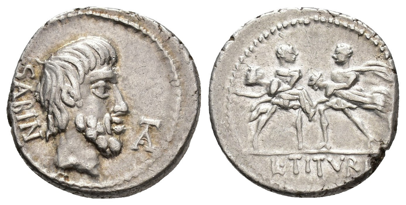 REPÚBLICA ROMANA. TITURIA. L. Titurius L. f. Sabinus. Denario. Roma (89 a.C.). A/ Cabeza del rey Tacio a der., delante TA (nexadas monograma), detrás SABIN. R/ Rapto de las sabinas, exergo L TITVRI. AR 3,98 g. 18,3 mm. CRAW-344-1a; FFC-1152. EBC-/EBC.