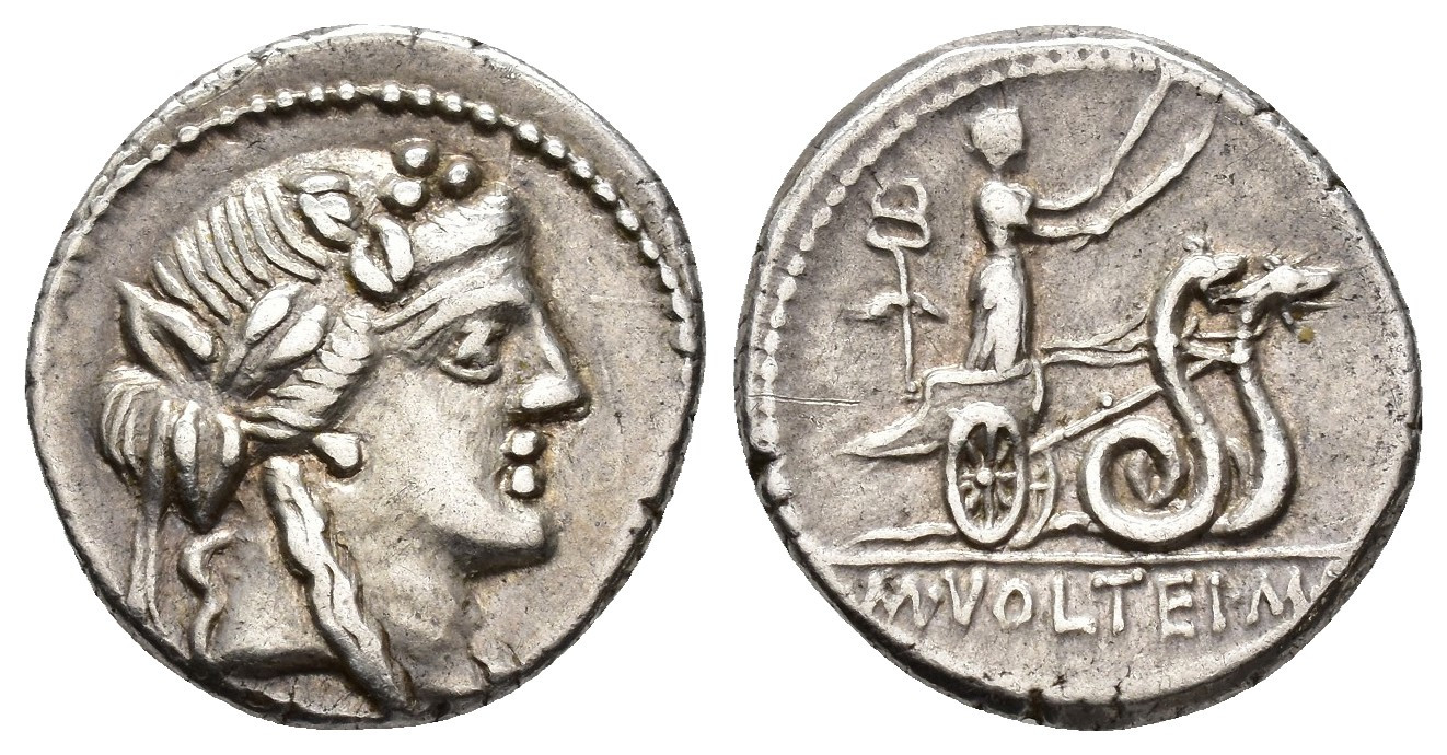 REPÚBLICA ROMANA. VOLTEIA. M. Volteius M. f. Roma. Denario (78 a.C.). A/ Cabeza de Baco a der. R/ Ceres con dos antorchas en biga de serpientes a der.; detrás caduceo; M VOLTEI M F. AR 3,8 g. 18,2 mm. CRAW-385.3; FFC-1231. MBC+.