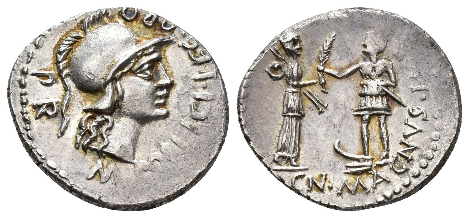 PERIODO DE JULIO CÉSAR A AUGUSTO. POMPEYO MAGNO. M. Poblicius, Denario. Hispania (46-45 a.C.). A/ Cabeza de Roma a der.; M POBLICI LEG PRO PR, gráfila de puntos y rayas. R/ Pompeyo sobre proa entregando una palma a la Bética, que porta escudo y dos jabalinas; CN MAGNVS I(MP). AR 3,82 g. 18,1 mm. CRAW-469.a; FFC-1. Vanos de acuñación. EBC-.