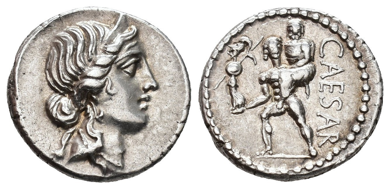 PERIODO DE JULIO CÉSAR A AUGUSTO. JULIO CÉSAR. Denario. Ceca incierta (47-46 a.C.). A/ Cabeza de Venus a der. R/ Eneas portando a Anquises a izq. y con palladium, detrás CAESAR. AR 3,86 g. 16,9 mm. CRAW-458.1; FFC-10. EBC-.
