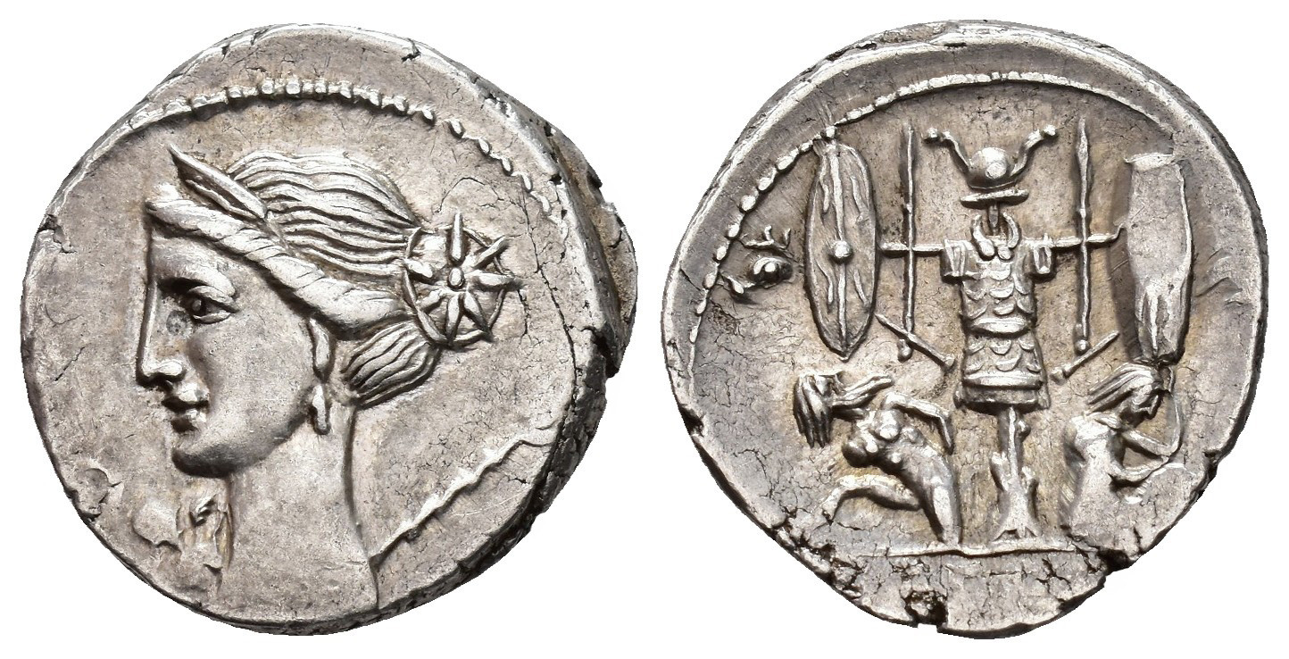 PERIODO DE JULIO CÉSAR A AUGUSTO. JULIO CÉSAR. Denario. Galia. Ceca móvil (46-45 a.C.). A/ Cabeza de Venus a izq., delante lítuo y Cupido, detrás cetro. R/ Trofeo flanqueado por dos cautivos (¿Galia y Vercingetorix?), exergo CAESAR. AR 3,97 g. 19,2 mm. CRAW-468.2; FFC-12. Fina grieta. EBC-.