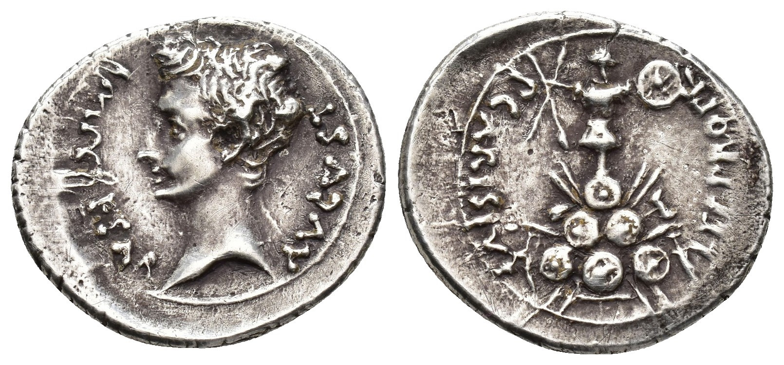 PERIODO DE JULIO CÉSAR A AUGUSTO. AUGUSTO. Denario. Emerita (23 a.C.). A/ Cabeza de Augusto a izq.; IMP. CAESAR AVGVST. R/ Trofeo sobre armas; P CARISIVS LEG PRO PR. AR 3,78 g. 19 mm. PR. RIC-4b; FFC-255. Limpiada. MBC+/MBC. Escasa.