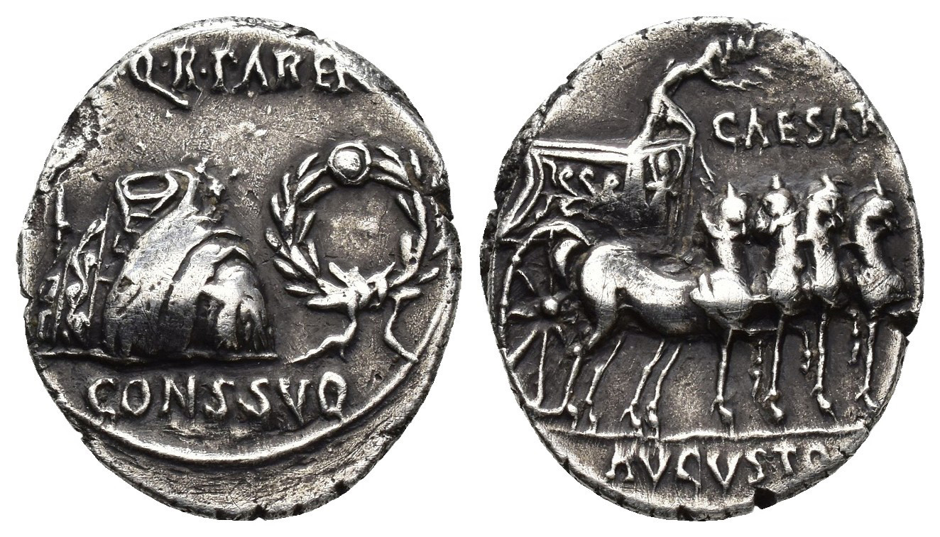 PERIODO DE JULIO CÉSAR A AUGUSTO. AUGUSTO. Denario. Colonia Patricia (18 a.C.). A/ Toga con túnica entre láurea y aquila; (S P) Q R PAREN/ CONS SVO. R/ Cuadriga a der. con 4 caballos miniatura; CAESAR(I)/AVGVSTO. AR 3,61 g. 19,8 mm. RIC-99 o 101; FFC-55 ss. Ligeramente abrillantada. MBC+. Escasa.