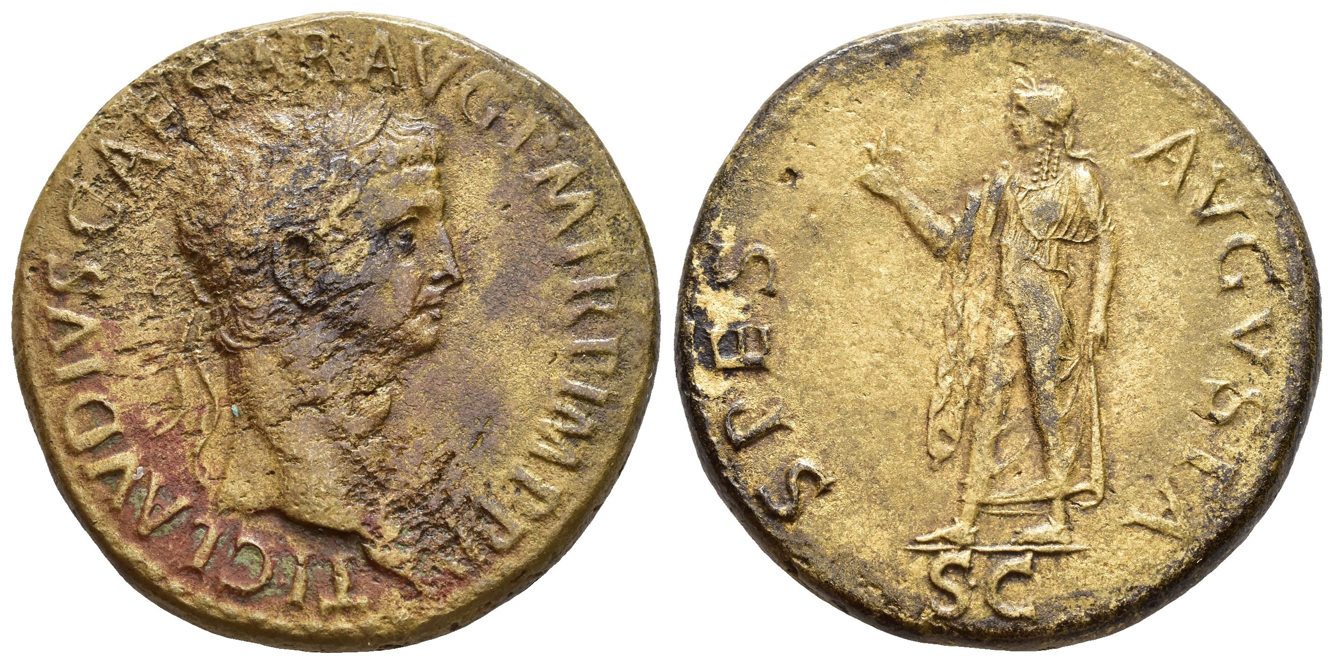 IMPERIO ROMANO. CLAUDIO I. Sestercio. Roma (50-54 d.C.). A/ Cabeza laureada a der.; TI CLAVDIVS CAESAR AVG P M TR P IMP P P. R/ Spes a izq.; SPES AVGVSTA, exergo S C. AE 28,96 g. 35,7 mm. RIC-115. Erosiones en anv. Pátina Tíber. MBC/MBC+.