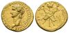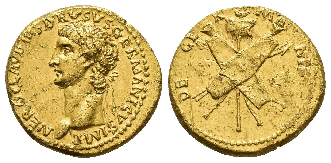 IMPERIO ROMANO. DRUSO EL MAYOR. Áureo. Roma (41-45 d.C.). A/ Cabeza laureada a izq.; NERO CLAVDIVS DRVSVS GERMANICVS IMP. R/ Dos escudos cruzados con lanza, trompas y vexilum,; DE GERMANIS. AU 7,84 g. 18,8 mm. RIC-73; Cal-317. Golpecitos y rayitas en anv. y rev. EBC. Rara.