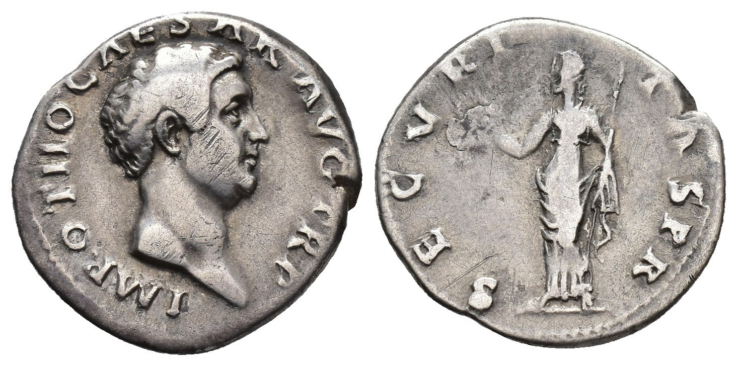 IMPERIO ROMANO. OTÓN. Denario. Roma (69 d.C.). A/ Cabeza a der.; IMP OTHO CAESAR AVG TR P. R/ Securitas a izq. con cetro y corona; SECVRITAS PRO. AR 3,32 g. 19,5 mm. RIC-10. Rayitas en anv. y hoja sin saltar en rev. MBC-/BC+. Muy escasa.
