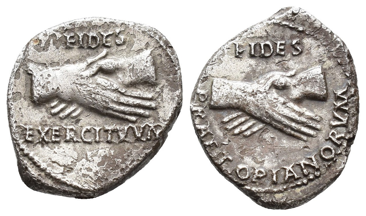 IMPERIO ROMANO. GUERRAS CIVILES. Denario. Ceca móvil (68-69 d.C.). A/ Manos estrechadas; FIDES EXERCITVVM. R/ Manos estrechadas; FIDES/ PRAETORIANORVM. AR 3,34 g. 18,85 mm. RIC-121. Flan irregular. Erosiones. MBC. Rara.