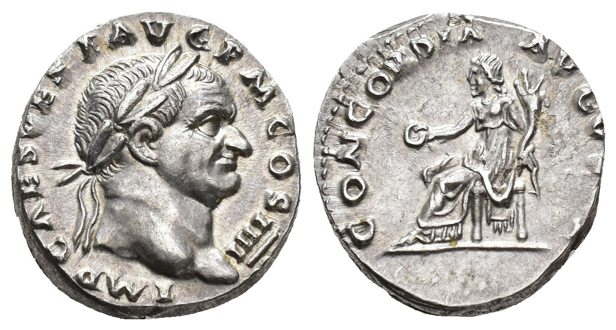 IMPERIO ROMANO. VESPASIANO. Denario. Roma (72-73 d.C.). A/ Cabeza laureada a der.; IMP CAES VESP AVG P M COS IIII. R/ Concordia sentada a izq. con pátera y cornucopia; CONCORDIA AVGV(STI). AR 3,35 g. 17,6 mm. RIC-357. EBC.