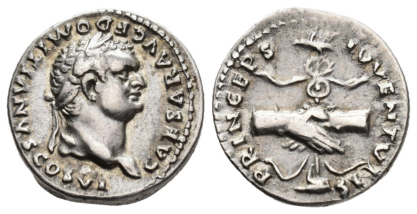 IMPERIO ROMANO. DOMICIANO (bajo Vespasiano). Roma (79 d.C.). A/ Cabeza laureada a der.; CAESAR AVG F DOMITIANVS COS VI. R/ Manos estrechadas sujetando aquila sobre proa; PRINCEPS IVVENTVTIS. AR 3,46 g. 18 mm. RIC-1081. MBC+.