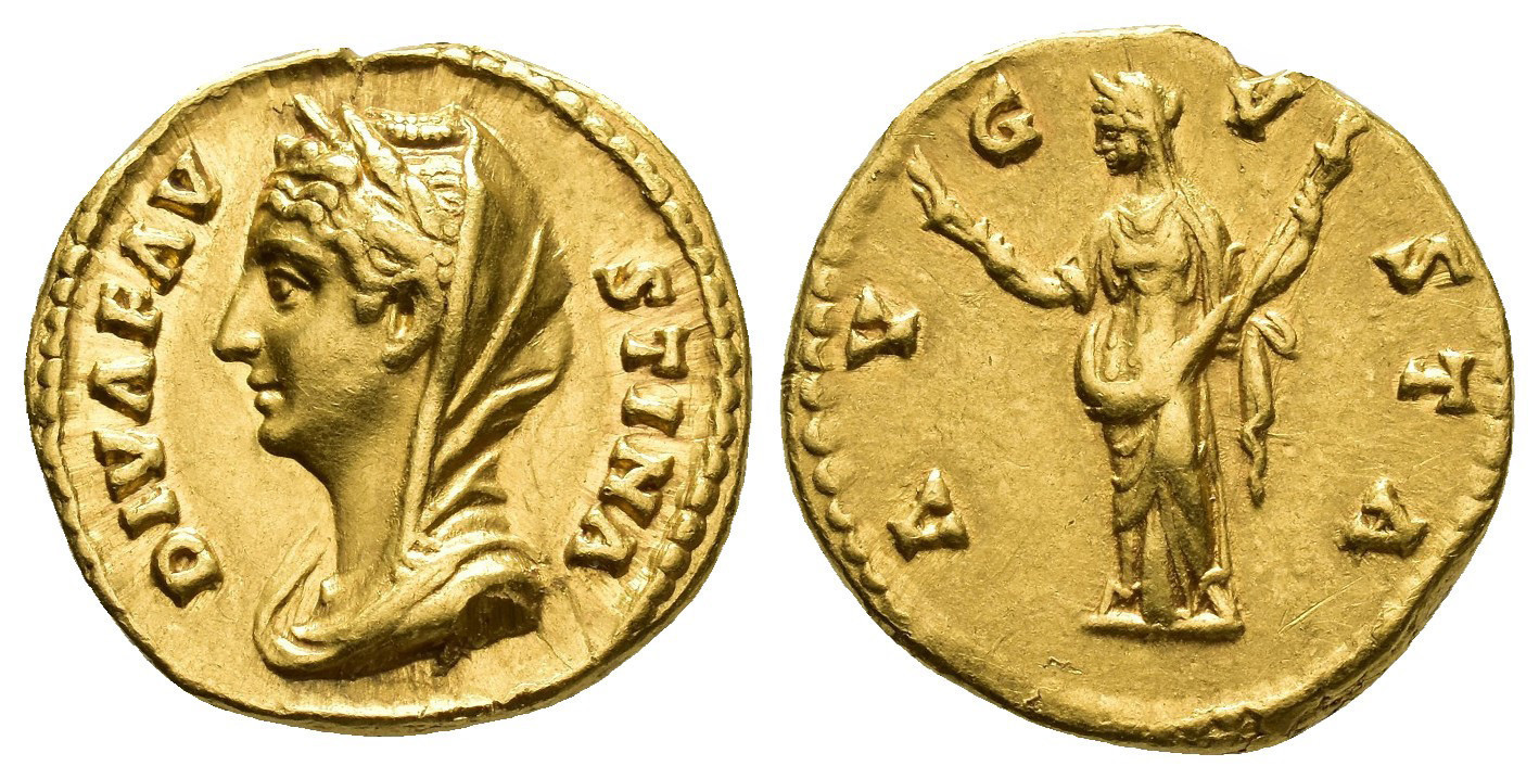IMPERIO ROMANO. FAUSTINA LA MAYOR. Áureo. Roma (141). A/ Busto laureado, velado y drapeado a izq.; DIVA FAVSTINA. R/ Ceres velada a izq. con una antorcha en cada mano; AVGVSTA. AU 7,52 g. 18,9 mm. RIC-357B; Cal-1759. R.B.O. EBC.