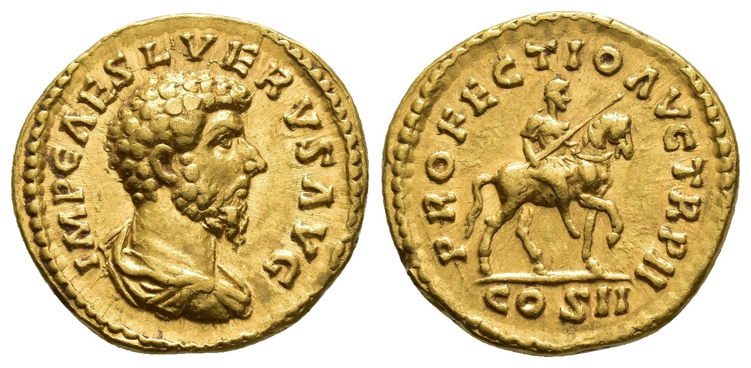 IMPERIO ROMANO. LUCIO VERO. Áureo. Roma (161-162). A/ Busto drapeado a der.; IMP CAES L VERVS AVG. R/ El emperador en traje militar a caballo con lanza a der.; PROFECTIO AVG TR P II, exergo COS II. AU 7,28 g. 19,8 mm. RIC-480; Cal-2144. R.B.O. MBC+.