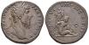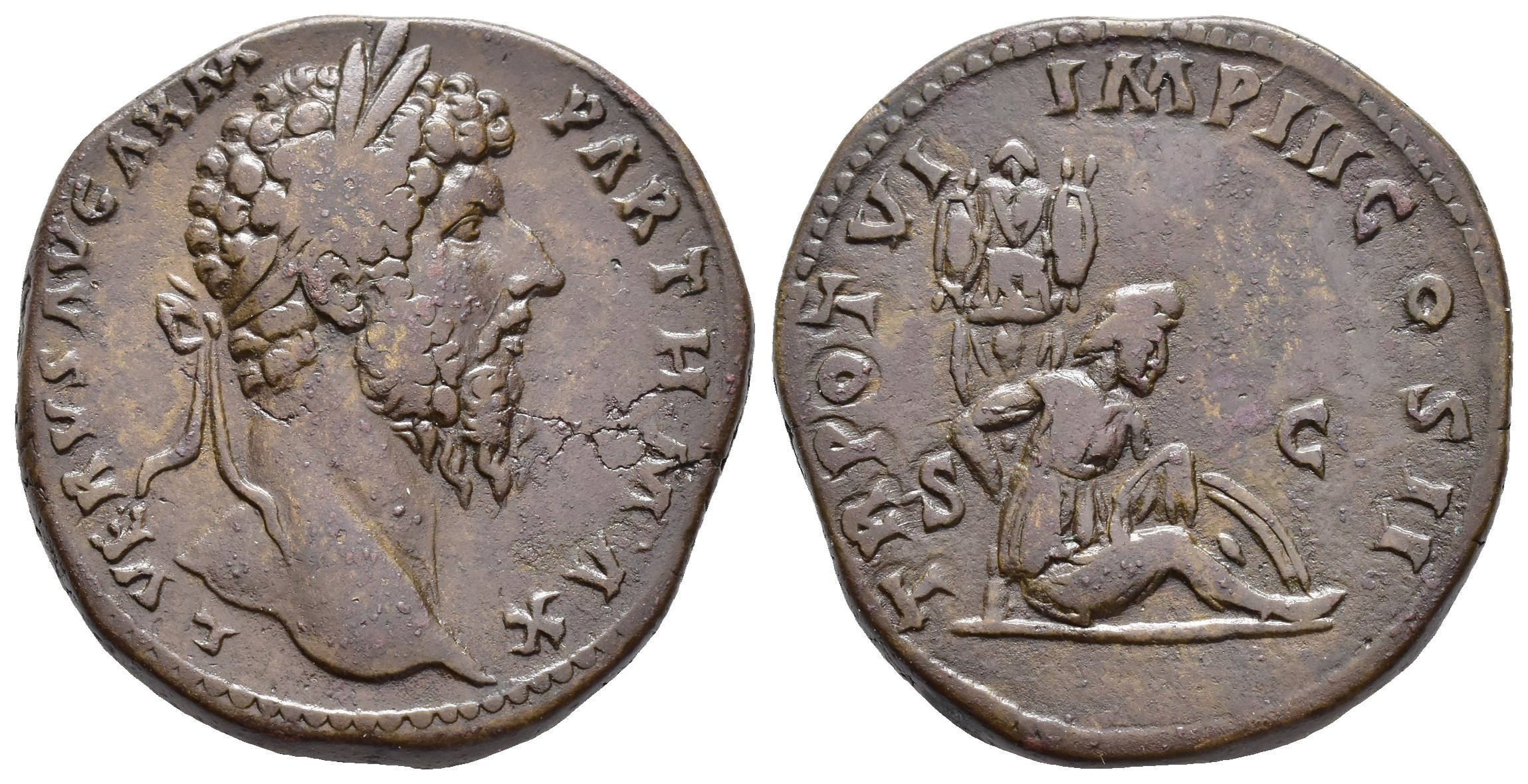 IMPERIO ROMANO. LUCIO VERO. Sestercio. Roma (165-166). A/ Cabeza laureada a der.; L VERVS AVG ARM PARTH MAX. R/ Parto sentado a der., detrás trofeo; TR POT VI IMP III COS II, S-C. AE 25,96 g. 32,1 mm. RIC-143. Defecto de cospel en anv. MBC. Escasa.