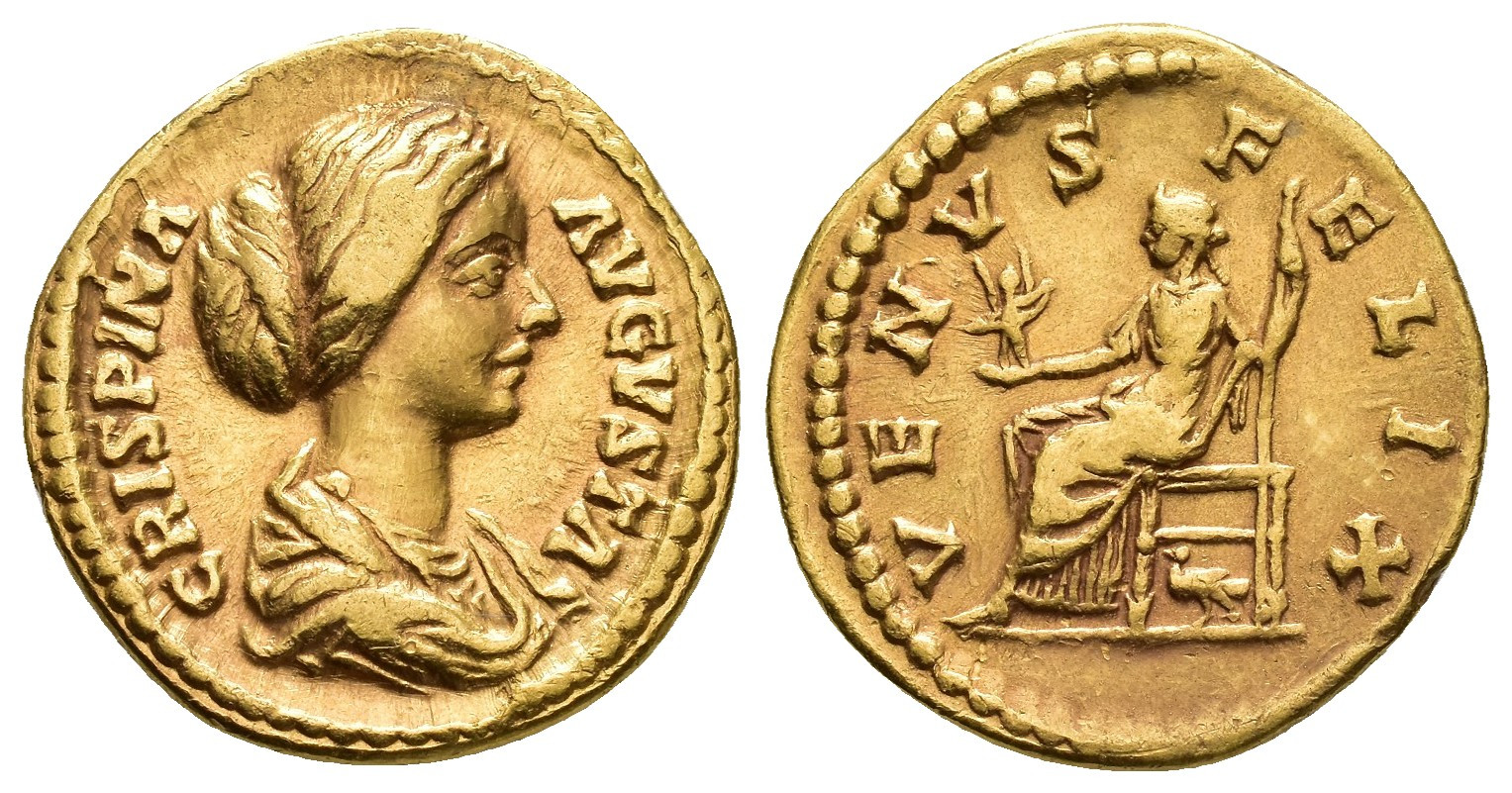 IMPERIO ROMANO. CRISPINA. Áureo. Roma (178-191). A/ Busto drapeado a der.; CRISPINA AVGVSTA. R/ Venus sentada a izq. con cetro y Victoria y paloma bajo el asiento; VENVS FELIX. AU 7,25 g. 20,7 mm. RIC-287; Cal-2377a. MBC+/MBC. Muy escasa.
