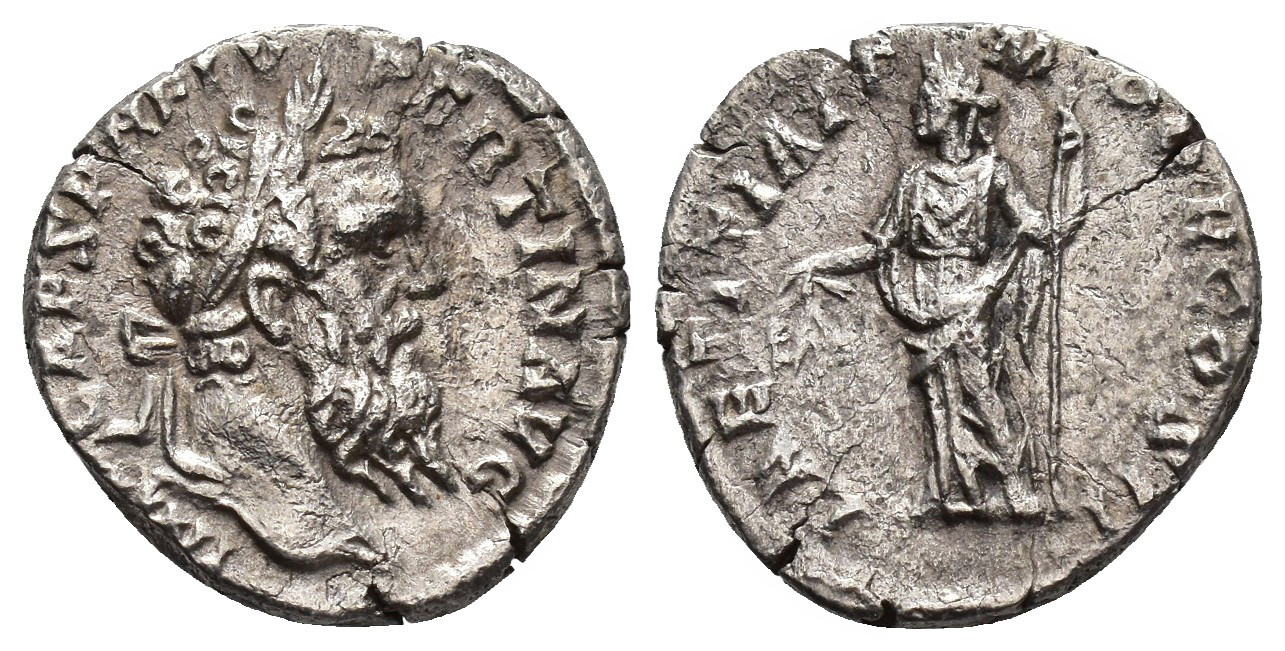 IMPERIO ROMANO. PÉRTINAX. Denario. Roma (193). A/ Cabeza laureada a der.; IMP CAES P HELV PERTIN AVG. R/ Laetitia a izq. con cornucopia y cetro; LAETITIA TEMPOR COS II. AR 2,65 g. 17,1 mm. RIC-4A. Pequeña grieta. Superficies erosionadas. MBC+. Rara.